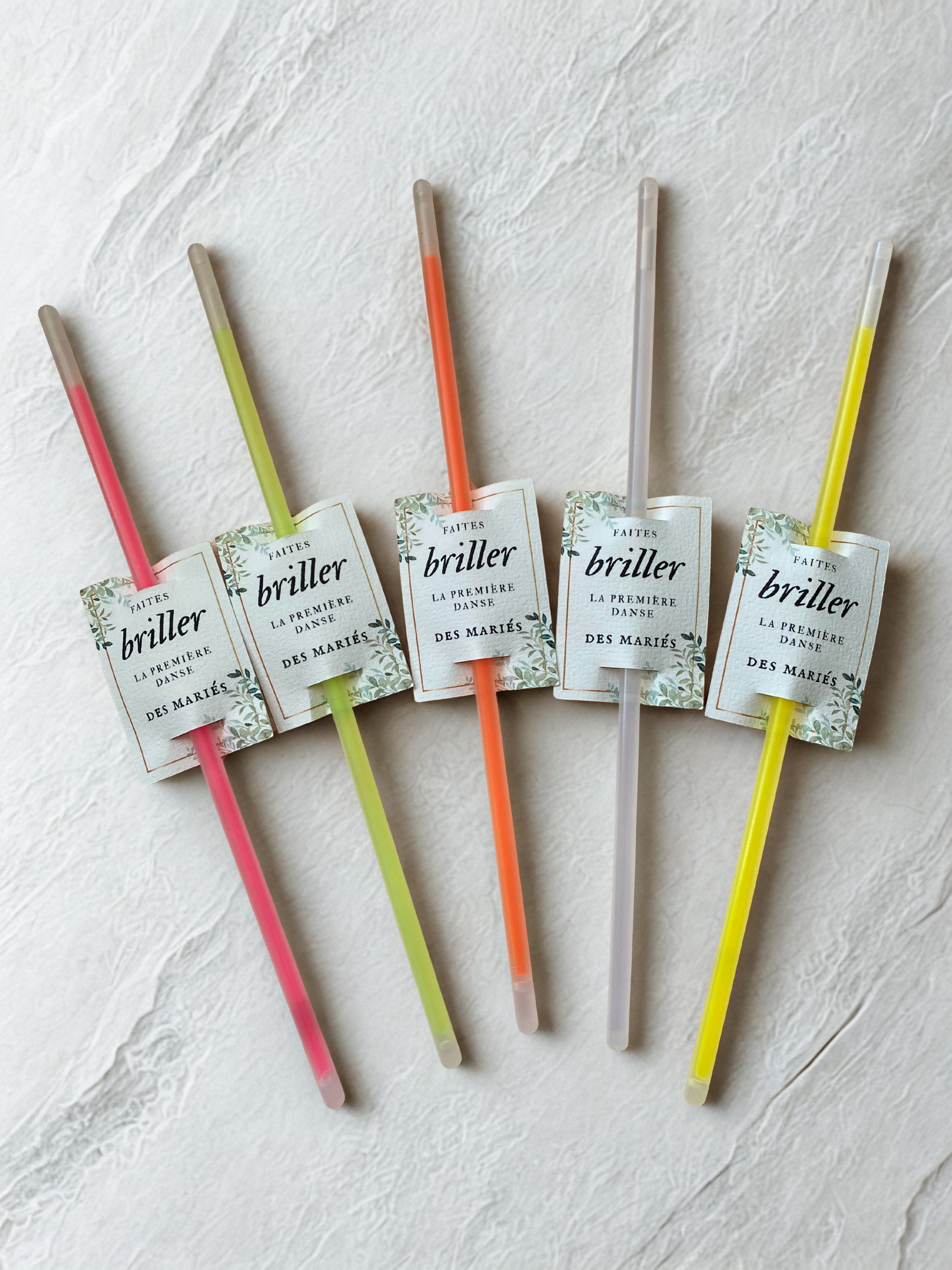 Bâtonnets lumineux avec étiquettes "Faites briller la première danse des mariés"